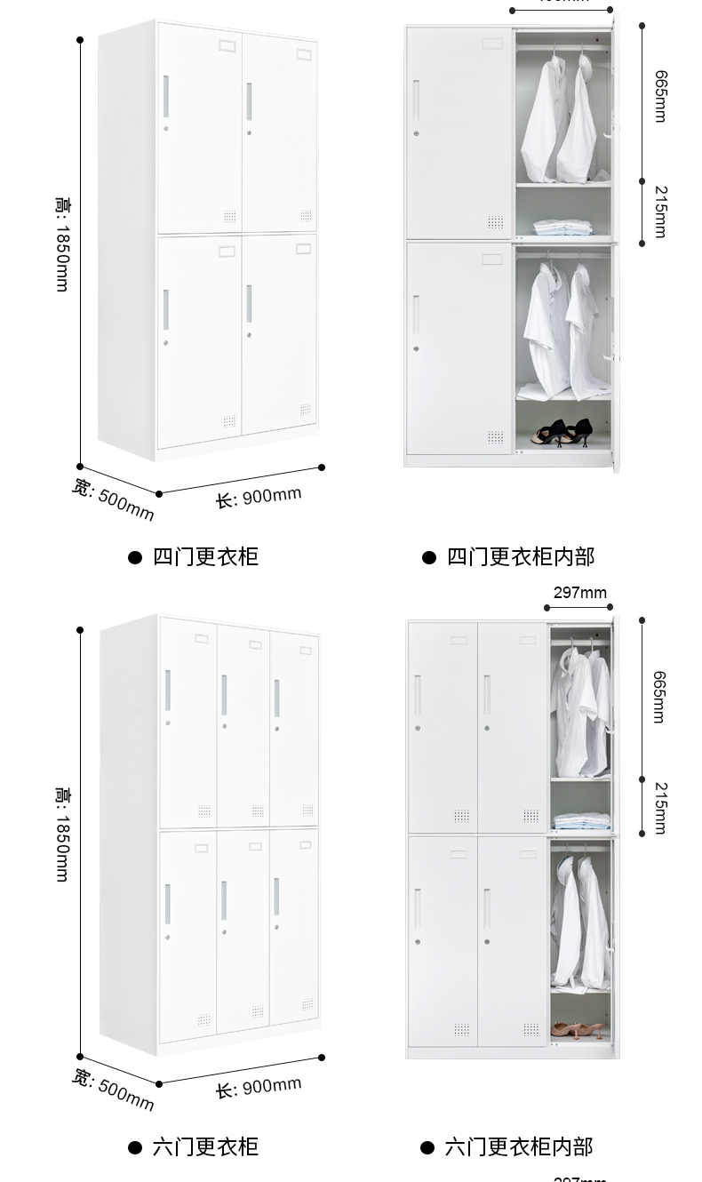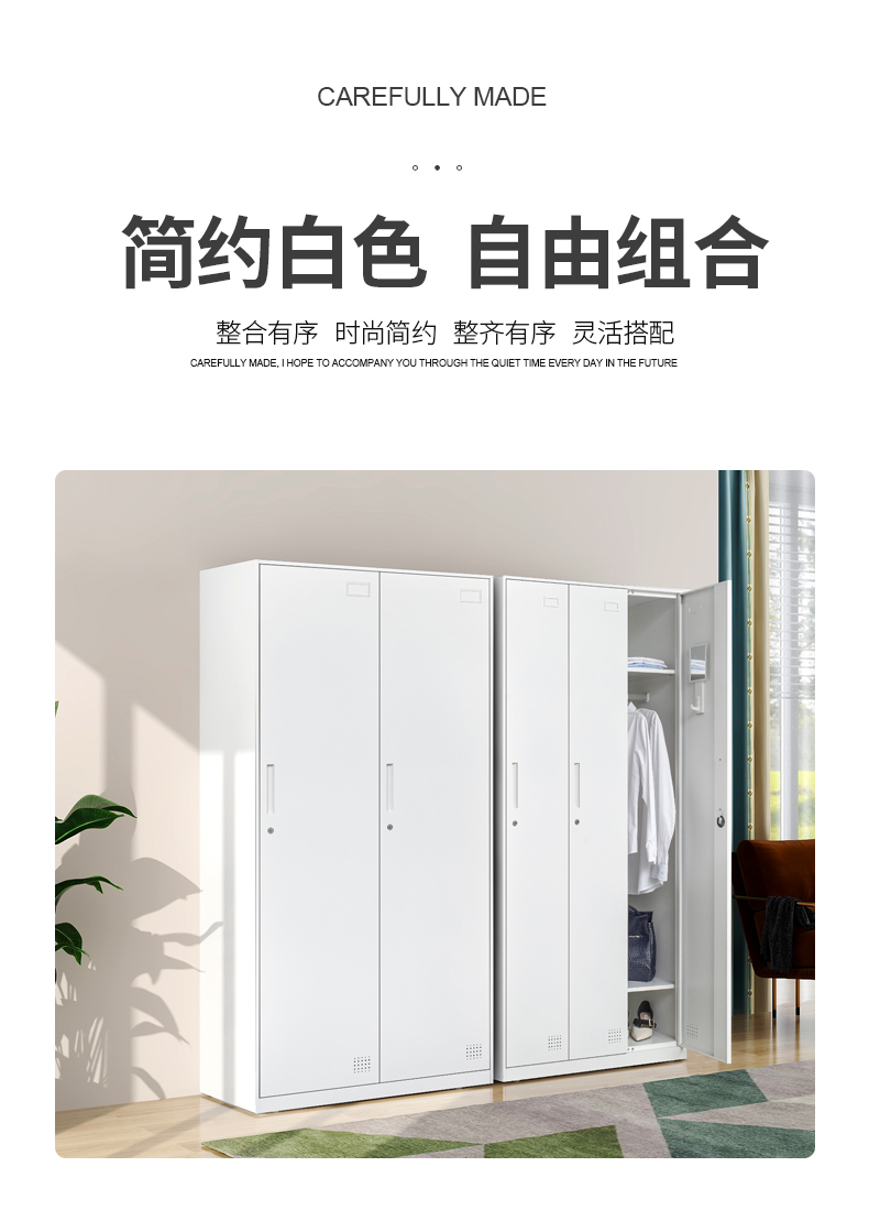 板材厚度0.7mm;每門內(nèi)一不可調(diào)層板,一掛衣桿,一毛巾鉤,一小鏡;望通阻尼鎖具