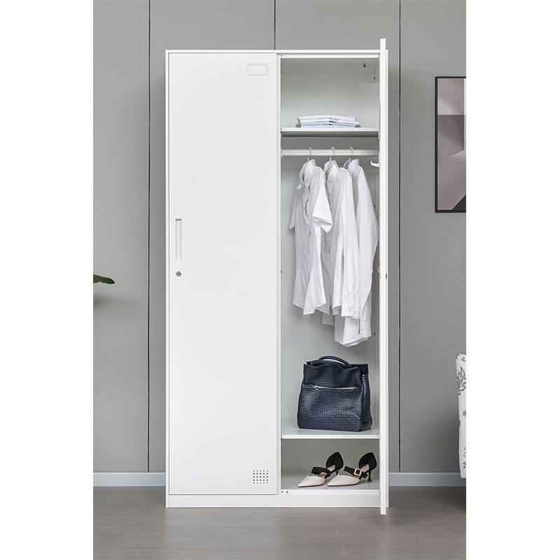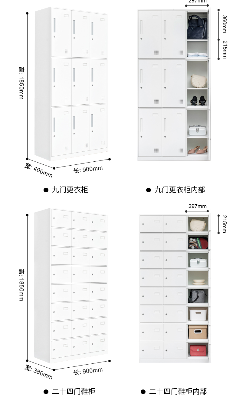 板材厚度0.7mm;每門內(nèi)一不可調(diào)層板,一掛衣桿,一毛巾鉤,一小鏡;望通阻尼鎖具