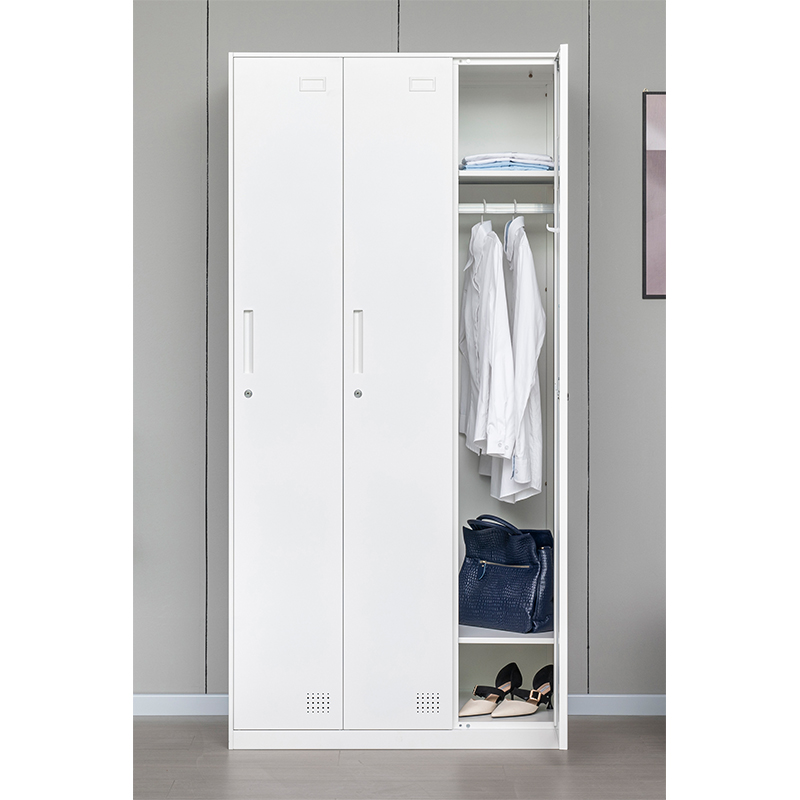 板材厚度0.7mm;每門(mén)內(nèi)一不可調(diào)層板,一掛衣桿,一毛巾鉤,一小鏡;望通阻尼鎖具