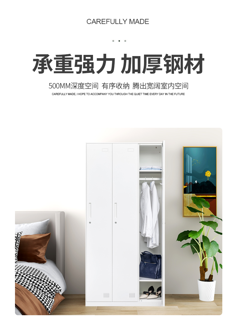 板材厚度0.7mm;每門內一不可調層板,一掛衣桿,一毛巾鉤,一小鏡;望通阻尼鎖具