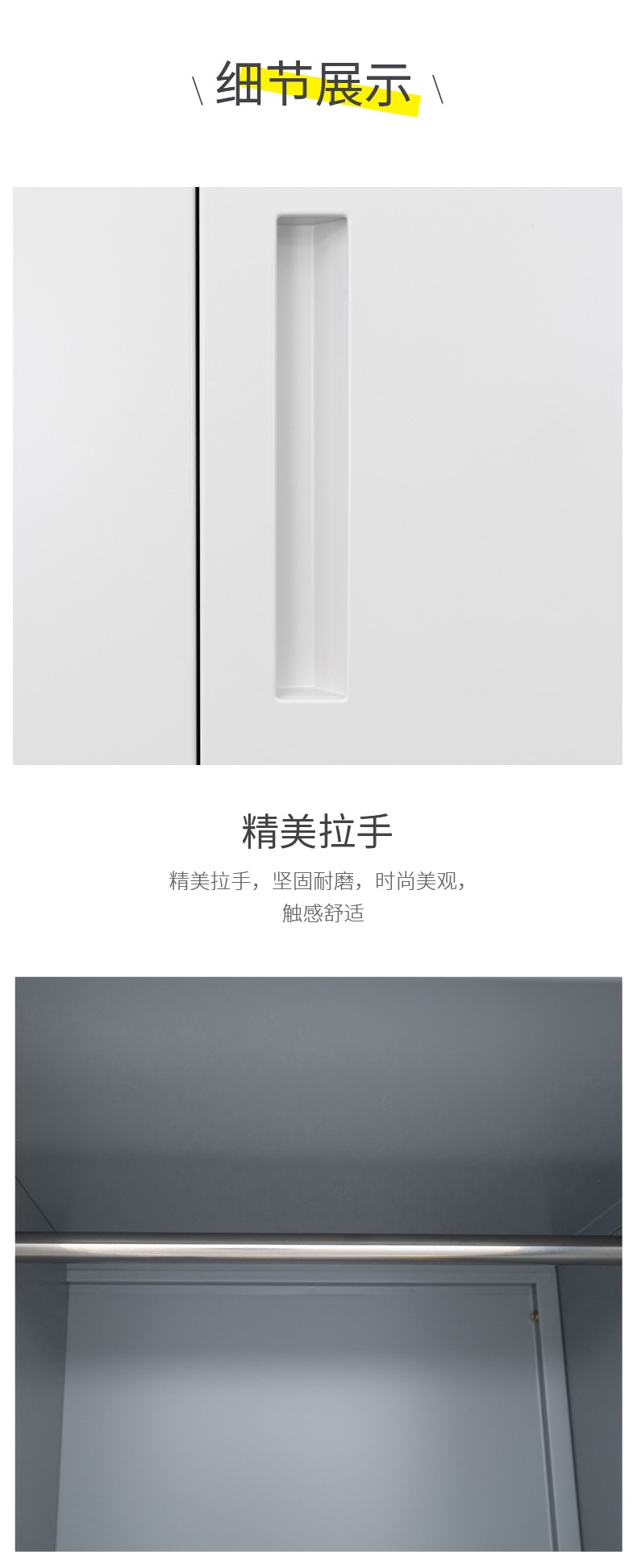 板材厚度0.7mm;每門內一不可調層板,一掛衣桿,一毛巾鉤,一小鏡;望通阻尼鎖具