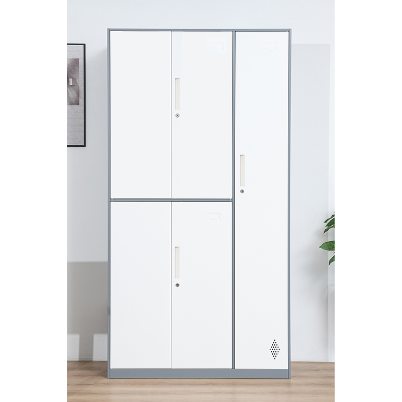 板材厚度0.7mm;左對開內(nèi)上二下一可調(diào)層板;右單門內(nèi)上一下一不可調(diào)層板,一掛衣桿,一毛巾鉤,一小鏡;望通阻尼鎖具