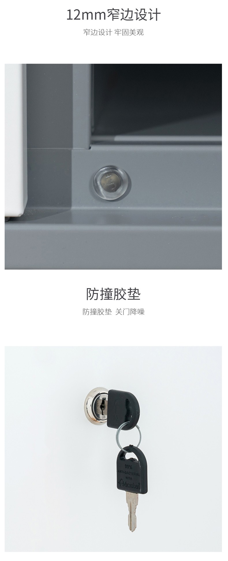 板材厚度0.7mm;左對開內(nèi)上二下一可調(diào)層板;右單門內(nèi)上一下一不可調(diào)層板,一掛衣桿,一毛巾鉤,一小鏡;鋼化玻璃;望通阻尼鎖具