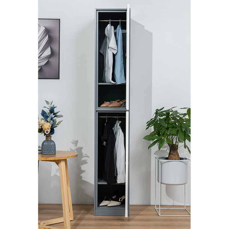 板材厚度0.7mm;每門(mén)內(nèi)一不可調(diào)層板,一掛衣桿,一毛巾鉤,一小鏡;望通阻尼鎖具